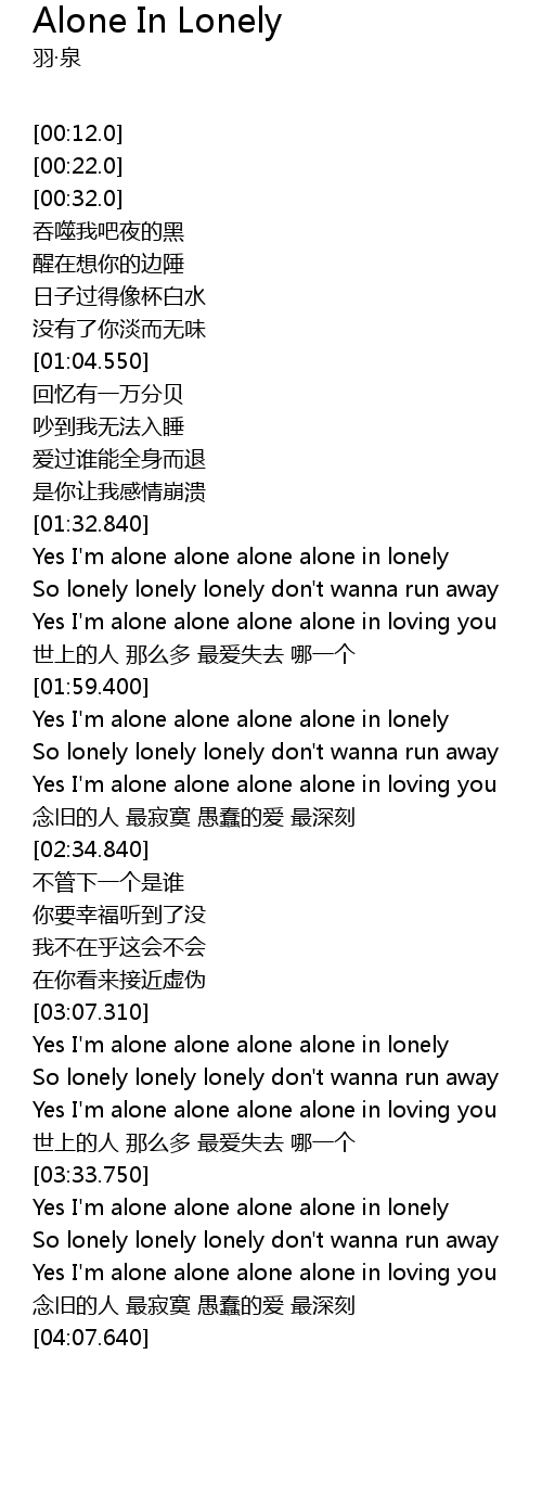 | [02:00.380] | Yes I' m alone alone alone alone in lonely |
