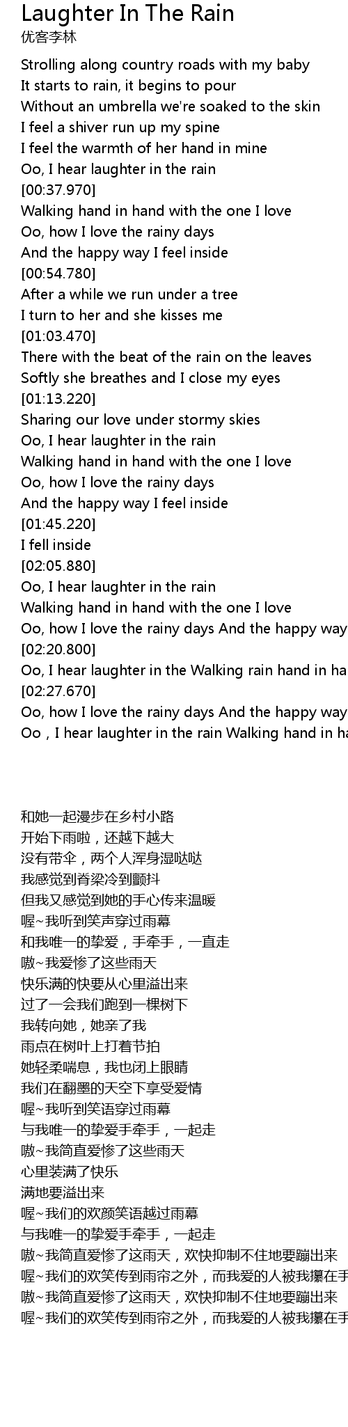 | [02:24.350] | Oo, I hear laughter in the Walking rain hand in hand with the one I love |