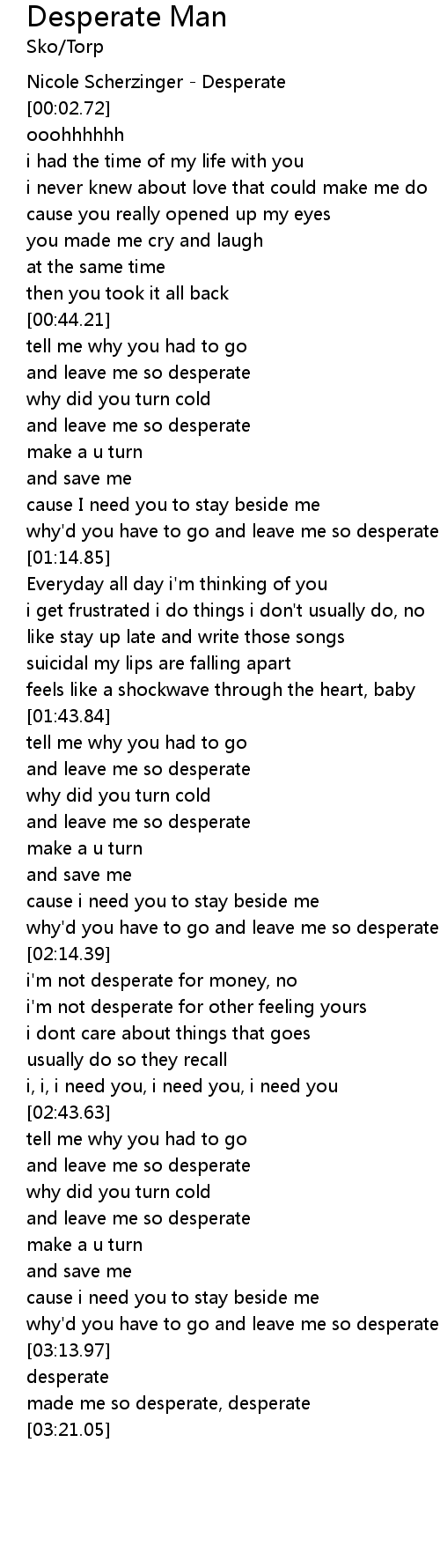 | [03:06.54] | why'd you have to go and leave me so desperate |