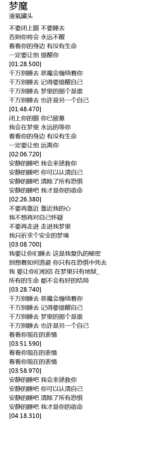 | [01:31.780] | 千万别睡去 恶魔会缠绕着你 |