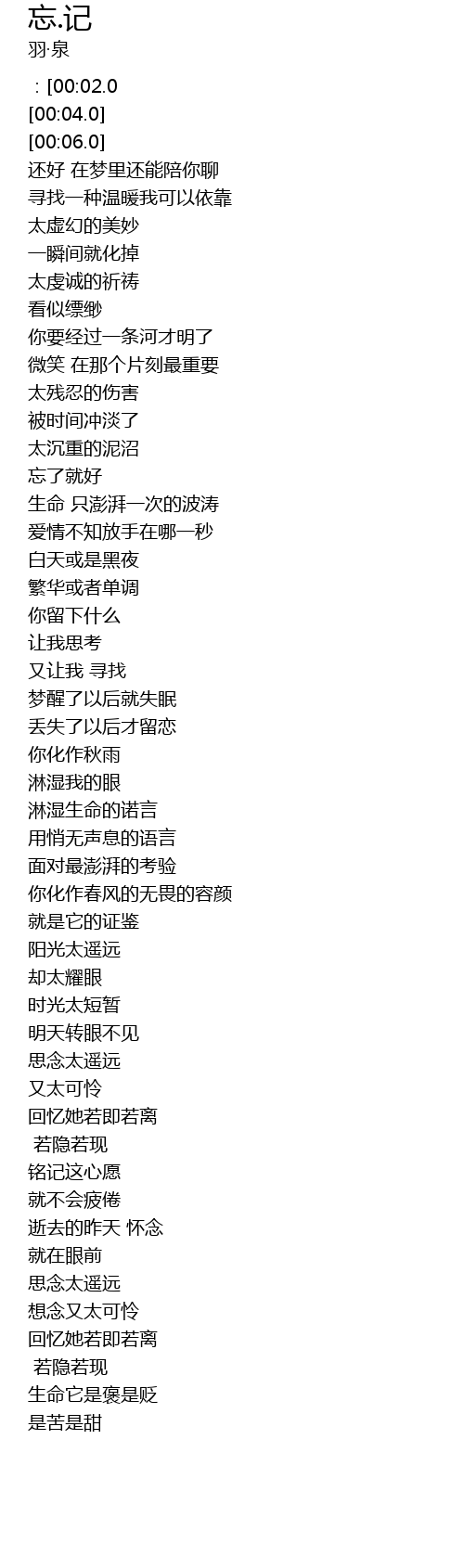 | [00:02.0] | 忘[羽凡吉他弹唱]:词曲:胡海泉 |