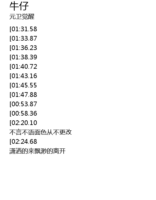 | [02:29.49][02:20.10][02:01.53][01:12.57][01:03.24] | 骑着黑马的西部牛仔 不言不语面色从不更改 |