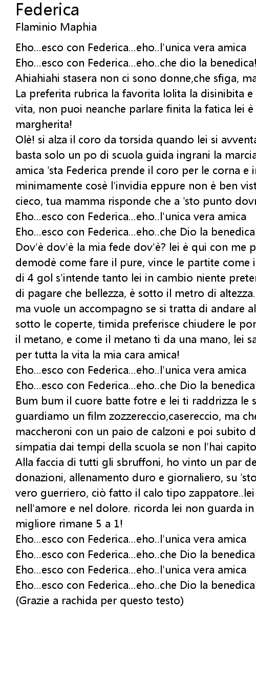 | Dov'e dov'e la mia fede dov'e? lei e qui con me pronta a farmi gode, non e demode come fare il pure, vince le partite come il grande pele. con lo scarto di 4 gol s' intende tanto lei in cambio niente pretende, al cinema non ha bisogno di pagare che bellezza, e sotto il metro di altezza. al ristorante non mangia ma vuole un accompagno se si tratta di andare al bagno, a casa gli piace stare sotto le coperte, timida preferisce chiudere le porte, e piena di energia come il metano, e come il metano ti da una mano, lei sara sempre la mia federica, e per tutta la vita la mia cara amica! | |