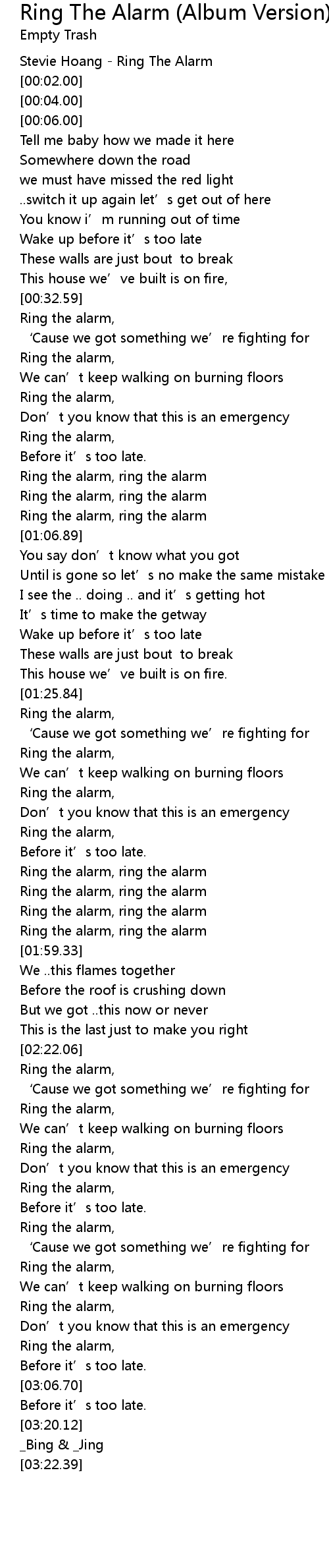 | [00:00.00] | Stevie Hoang Ring The Alarm |