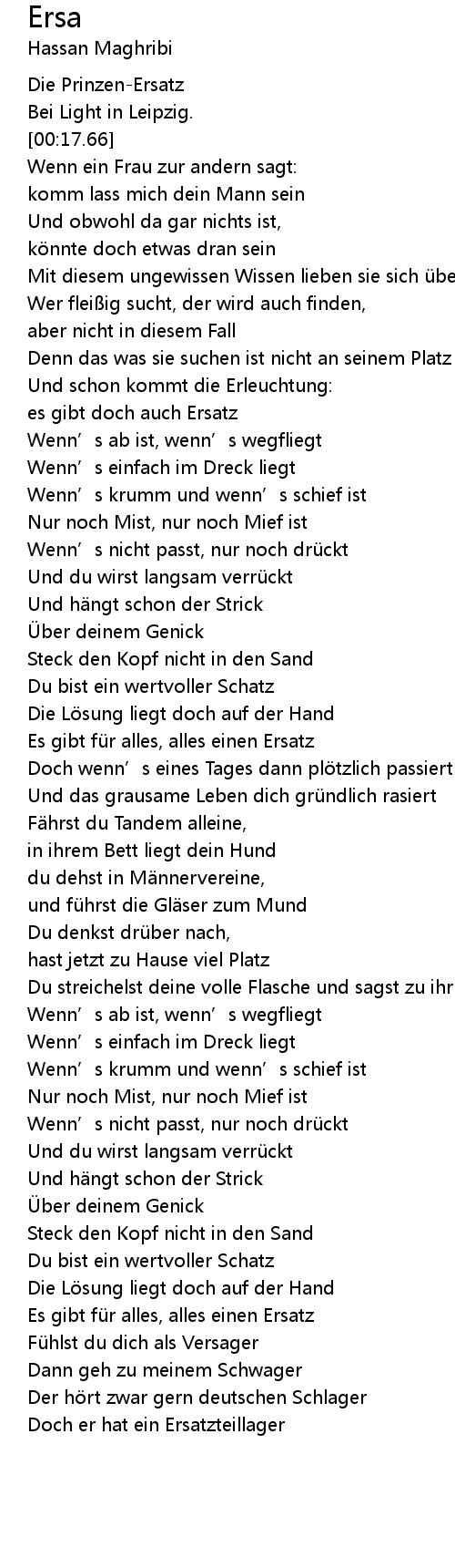 | [02:36.22] | Es gibt für alles, alles einen Ersatz |