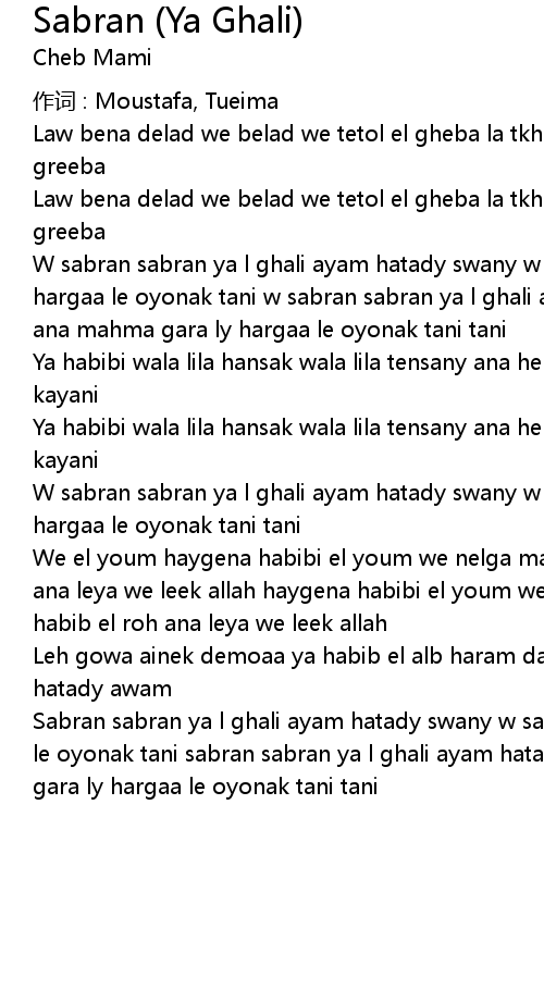 | W sabran sabran ya l ghali ayam hatady swany w sabran wa ana mahma gara ly hargaa le oyonak tani w sabran sabran ya l ghali ayam hatady swany w sabran wa ana mahma gara ly hargaa le oyonak tani tani | |