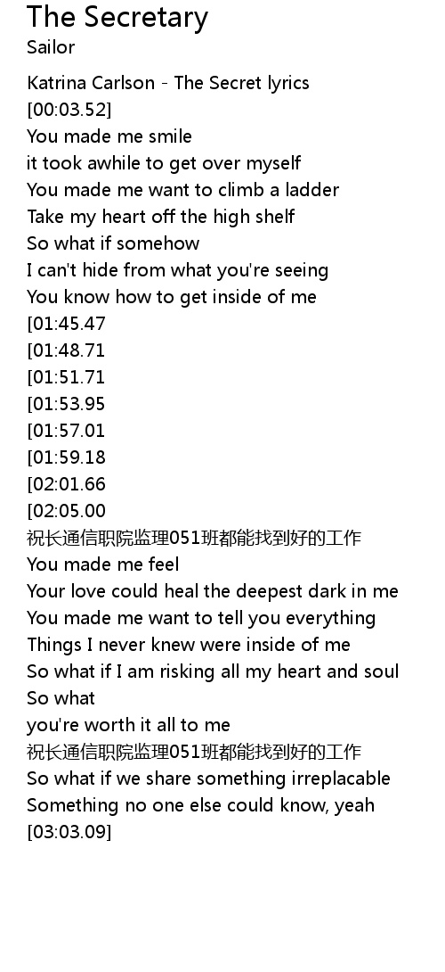| [00:01.11] | Katrina Carlson - The Secret lyrics |