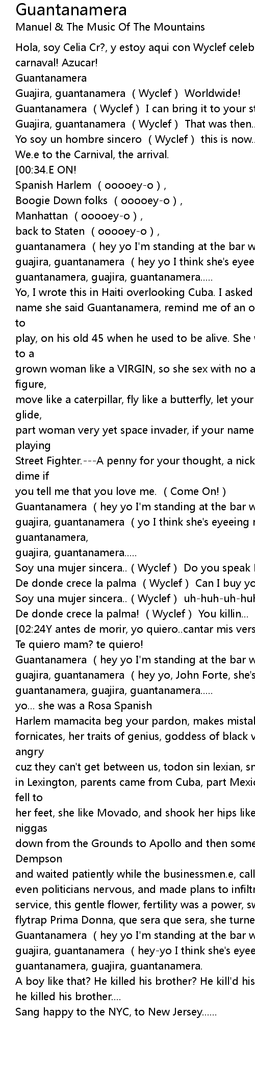 | [00:14] | Guantanamera Wyclef I can bring it to your stereo.. |