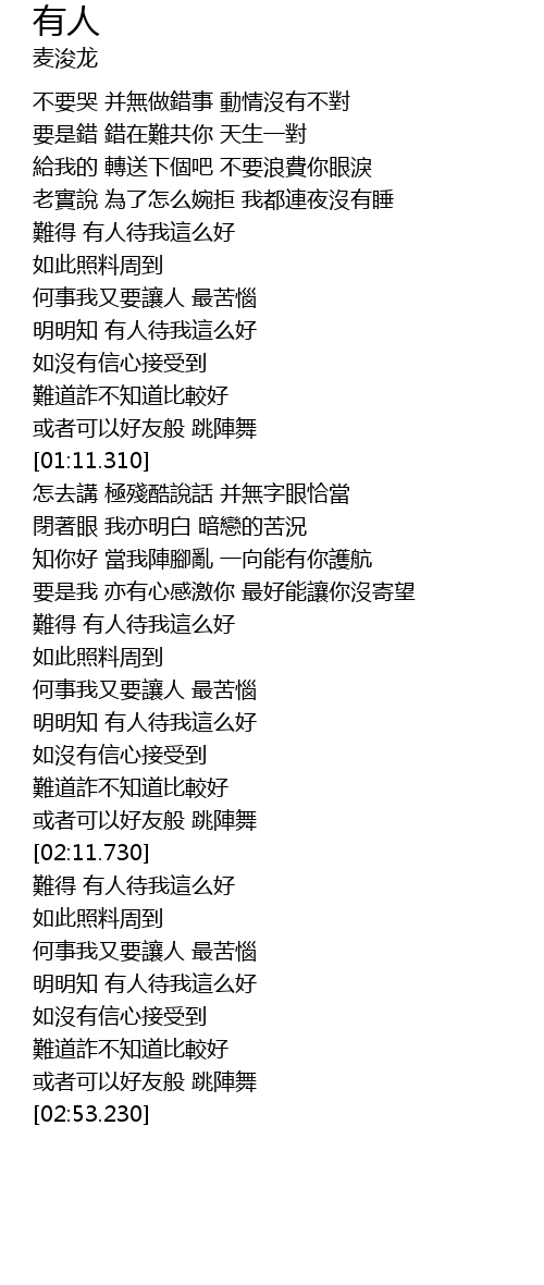 | [00:15.230] | 不要哭 并無做錯事 動情沒有不對 |