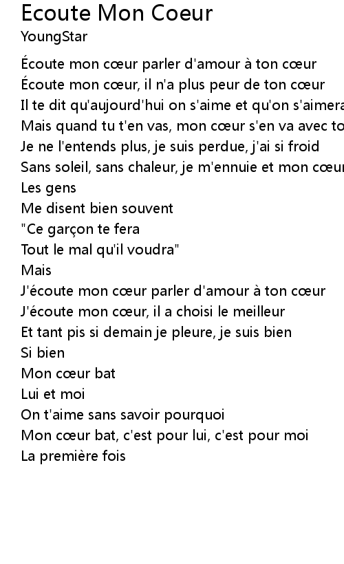 | [01:35.645] | J'e coute mon c ur parler d' amour a ton c ur |