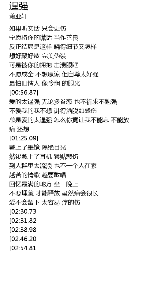| [03:00.10][02:31.82] | 爱的太逞强 无论多眷恋 也不祈求不勉强 |