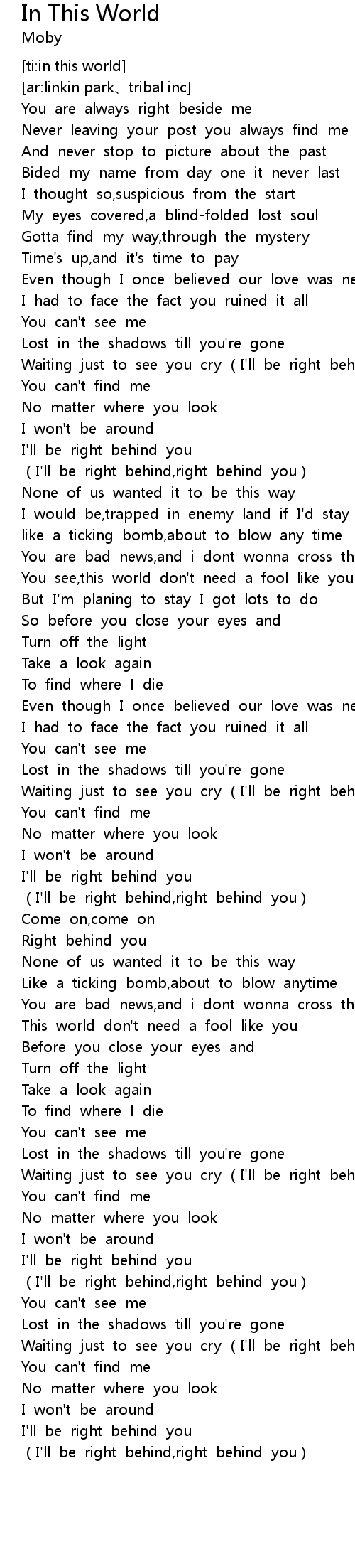 | [01:50.668] | Waiting just to see you cry I' ll be right behind you |