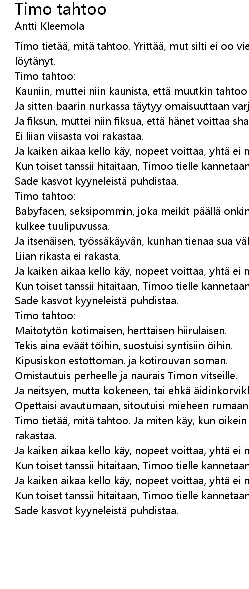 | Timo tiet, mit tahtoo. Ja miten k y, kun oikein itse n ei osaa rakastaa. | |