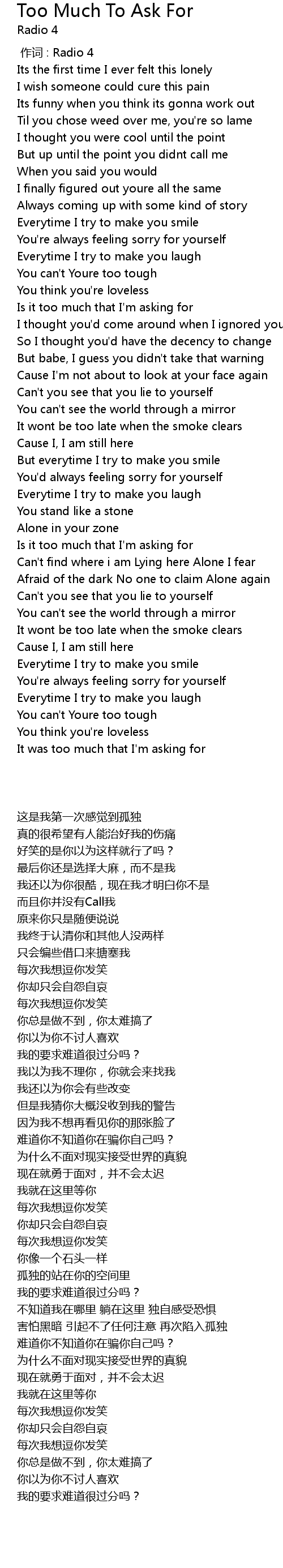 | [02:23.830] | Is it too much that I' m asking for |
