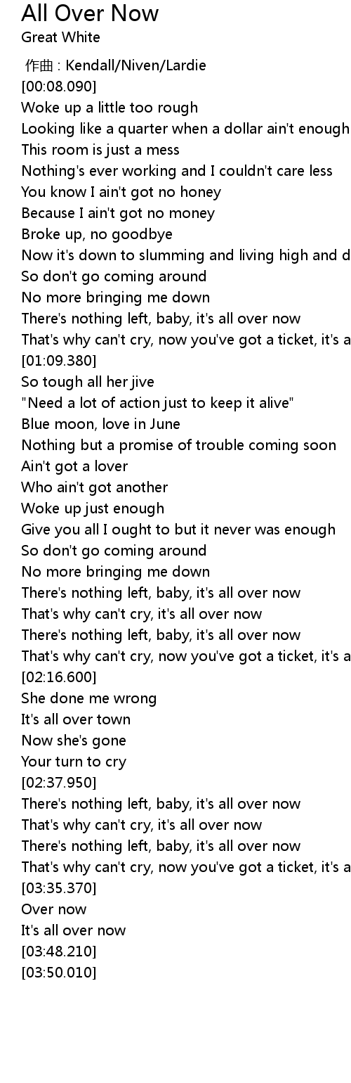 | [01:48.710] | There' s nothing left, baby, it' s all over now |