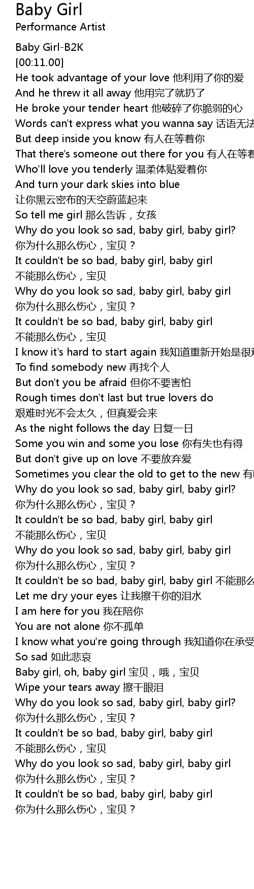 | [02:19.32] | Why do you look so sad, baby girl, baby girl? ni wei shi me na me shang xin, bao bei? |