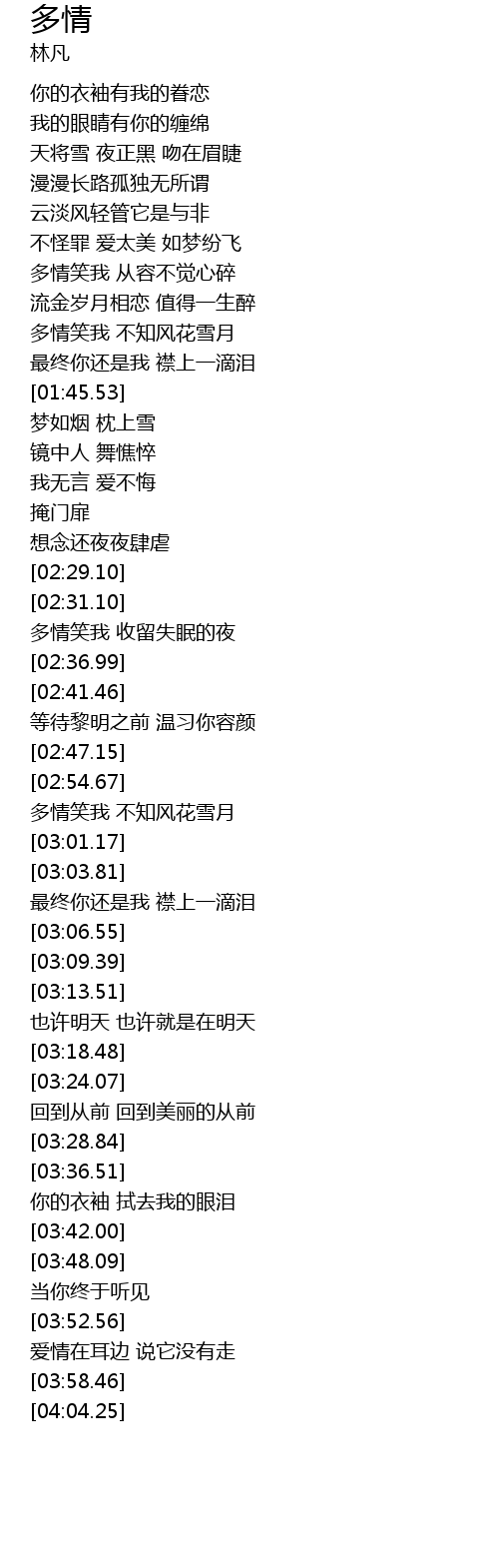 | [01:02.39] | 多情笑我 从容不觉心碎 |