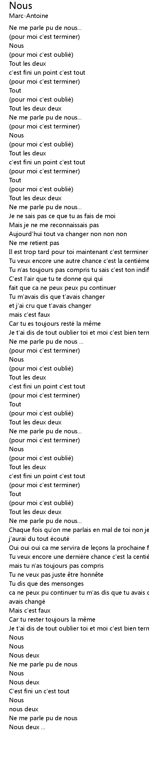 | Je t' ai dis de tout oublier toi et moi c' est bien terminer car s' en est trop | |