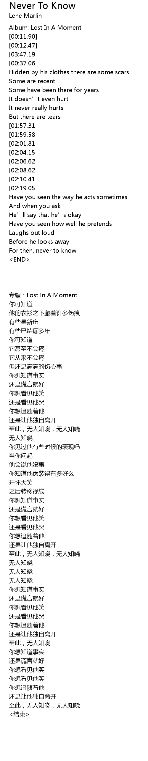 | [01:15.96][02:19.05][02:23.57][02:28.05] | Never to know |