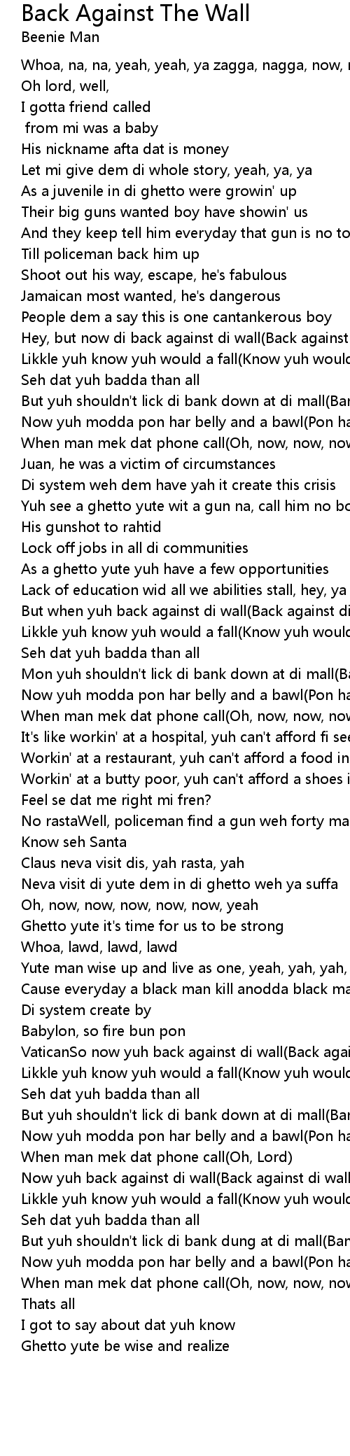 VaticanSo now yuh back against di wall(Back against di wall) |