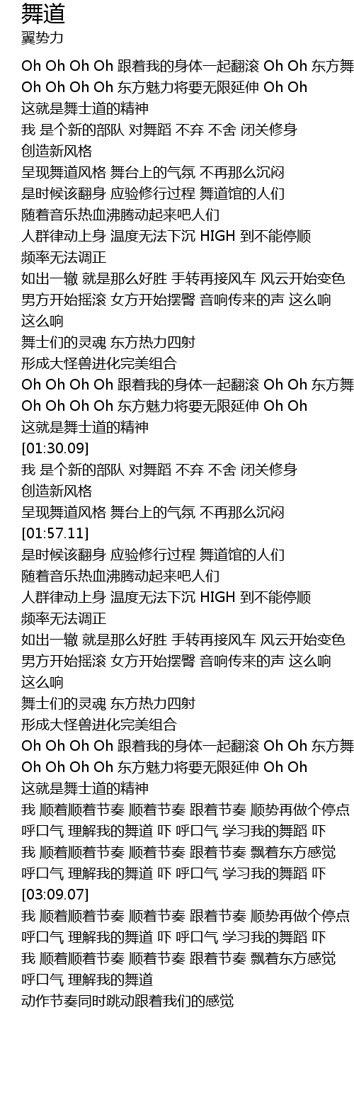 | [01:20.04] | Oh Oh Oh Oh 东方魅力将要无限延伸 Oh Oh 这就是舞士道的精神 |