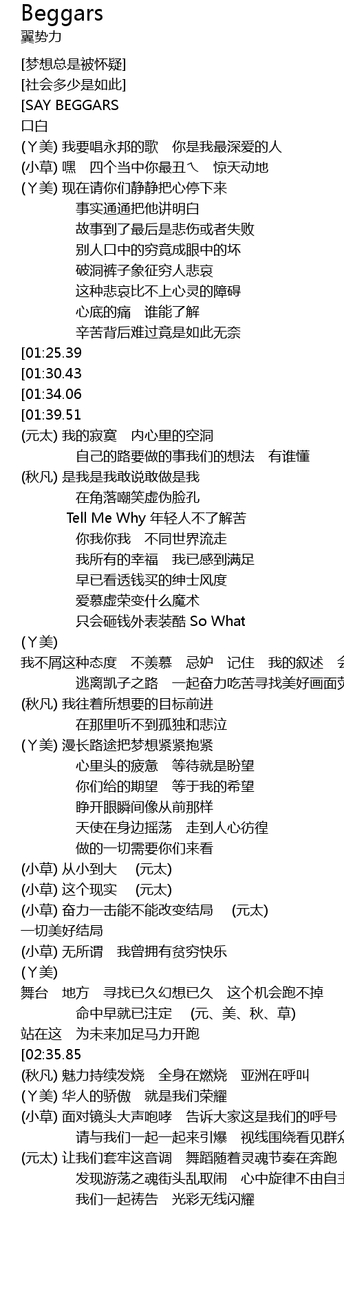 | [00:28.82][01:25.39] | (小草) 没有家回的穷人或许感受那份孤独寂寞 |