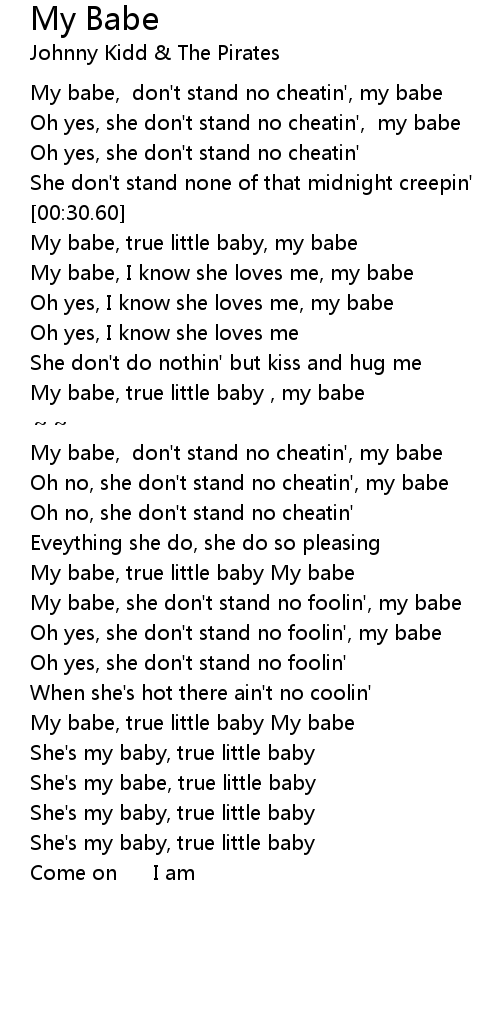 | [00:18.49] | Oh yes, she don' t stand no cheatin', my babe |