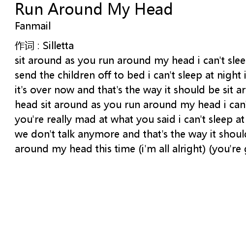 | sit around as you run around my head i can' t sleep at night it' s getting late so send the children off to bed i can' t sleep at night i know you you know me but it' s over now and that' s the way it should be sit around as you run around my head sit around as you run around my head i can' t sleep at night i can see that you' re really mad at what you said i can' t sleep at night i know you you know me we don' t talk anymore and that' s the way it should be sit around as you run around my head this time i' m all alright you' re gone |