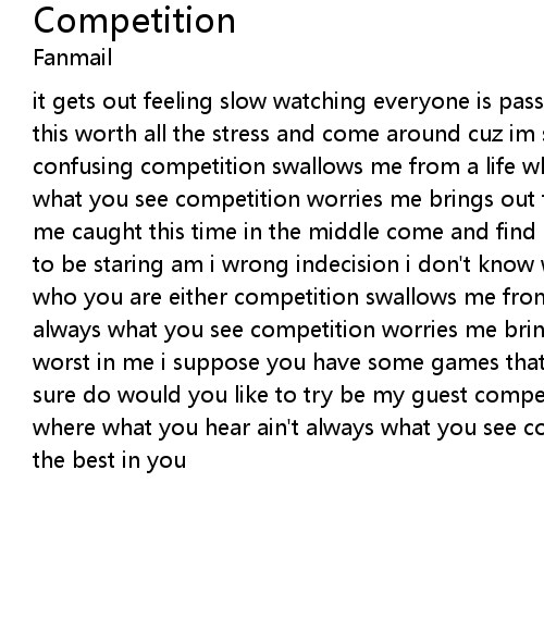 it gets out feeling slow watching everyone is passing by and im still here is this worth all the stress and come around cuz im still down everything is so confusing competition swallows me from a life where what you hear ain't always what you see competition worries me brings out the best in you and the worst in me caught this time in the middle come and find a common ground everyone seems to be staring am i wrong indecision i don't know who ive become and i'm not sure who you are either competition swallows me from a life where what you hear ain't always what you see competition worries me brings out the best in you and the worst in me i suppose you have some games that you would love to play with me i sure do would you like to try be my guest competition swallows me from a life where what you hear ain't always what you see competition worries me brings out the best in you