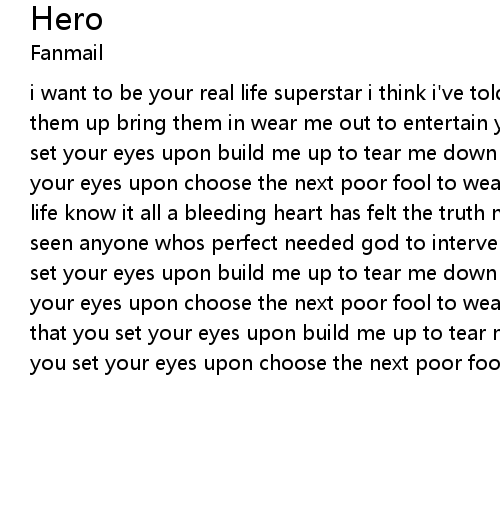 i want to be your real life superstar i think i've told you once before line them up bring them in wear me out to entertain you i wanna be the hero that you set your eyes upon build me up to tear me down i wanna be the hero that you set your eyes upon choose the next poor fool to wear the crown i wanna be your real life know it all a bleeding heart has felt the truth nine more years i've never seen anyone whos perfect needed god to intervene i wanna be the hero that you set your eyes upon build me up to tear me down i wanna be the hero that you set your eyes upon choose the next poor fool to wear the crown i wanna be the hero that you set your eyes upon build me up to tear me down i wanna be the hero that you set your eyes upon choose the next poor fool to wear the crown |