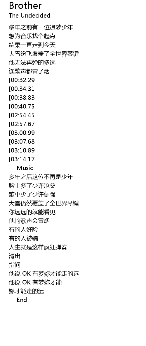 | [03:20.80][02:54.45][02:14.63][00:48.61] | 哥哥说 Byebye My Brother |