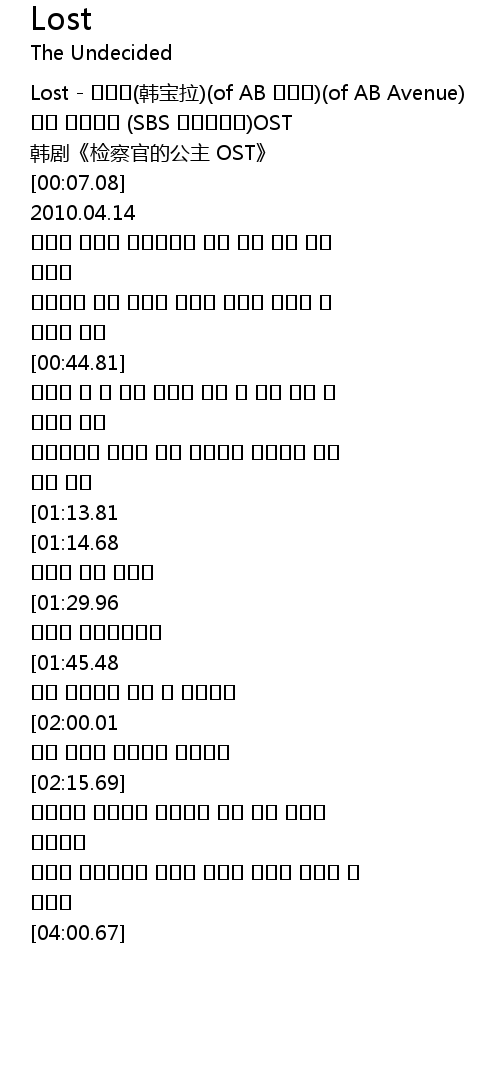 | [00:01.37] | Lost - 한보라(韩宝拉)(of AB 에비뉴)(of AB Avenue) |
