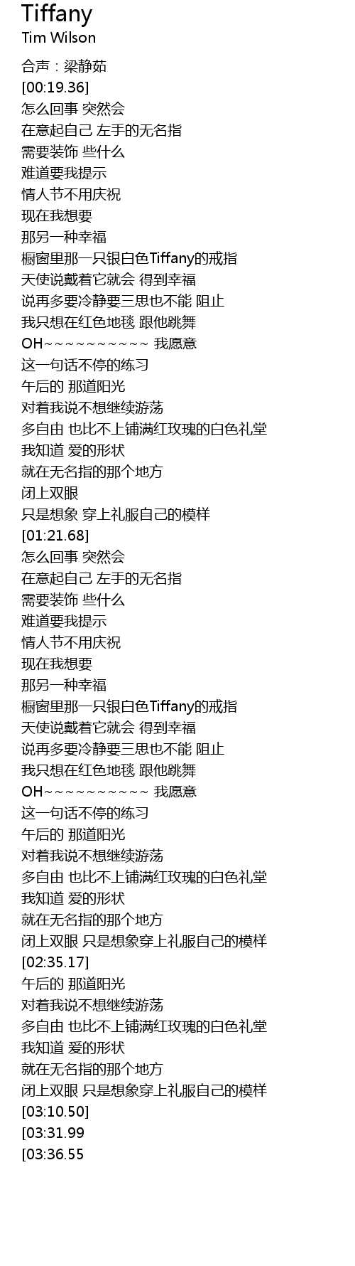 | [00:36.44] | 橱窗里那一只银白色Tiffany的戒指 |