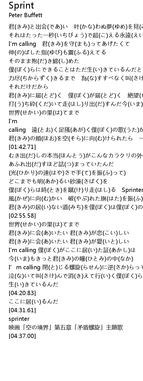 | [02:14.02] | 僕(ぼく)らは時(とき)を蹴(け)り走(はし)る Sprinter |