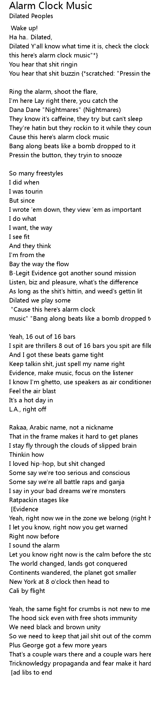 Dilated Y'all know what time it is, check the clock {*scratch repeats: "Cause this here's alarm clock music"*} |