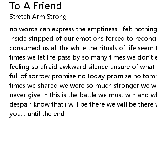 no words can express the emptiness i felt nothing can hide the way we felt inside stripped of our emotions forced to reconcile the suffering of a friend consumed us all the while the rituals of life seem to lose their shine so many times we let life pass by so many times we don't even try feelign so useless feeling so afraid awkward silence unsure of what to say drowning in an ocean full of sorrow promise no today promise no tommorrow look back and remember the times we shared we were so much stronger we were never scared never give up never give in this is the battle we must win and when you're in the depths of despair know that i will be there we will be there we'll comfort you we'll carry you... until the end