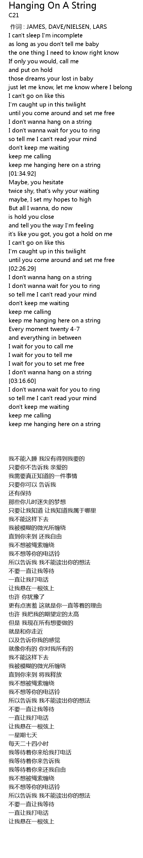 | [01:14.34] | I don' t wanna hang on a string |