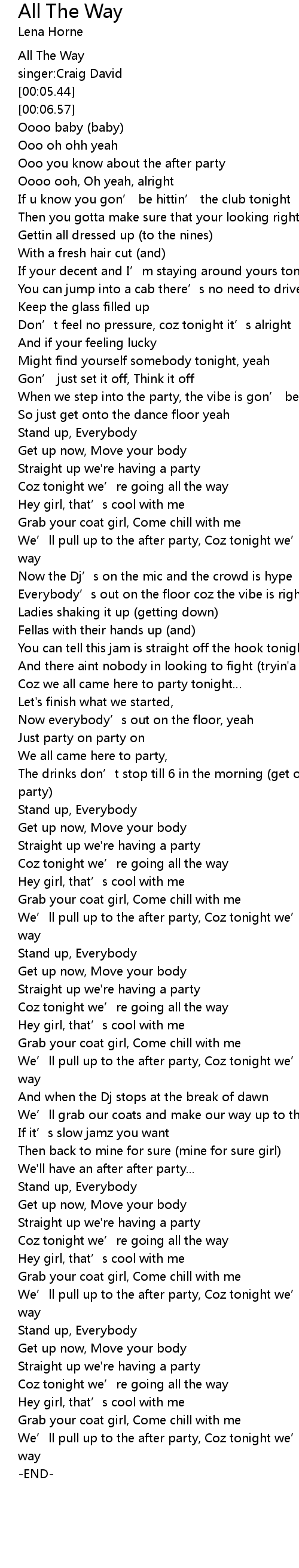 | [02:34.79] | We’ll pull up to the after party, Coz tonight we’re going all the way |