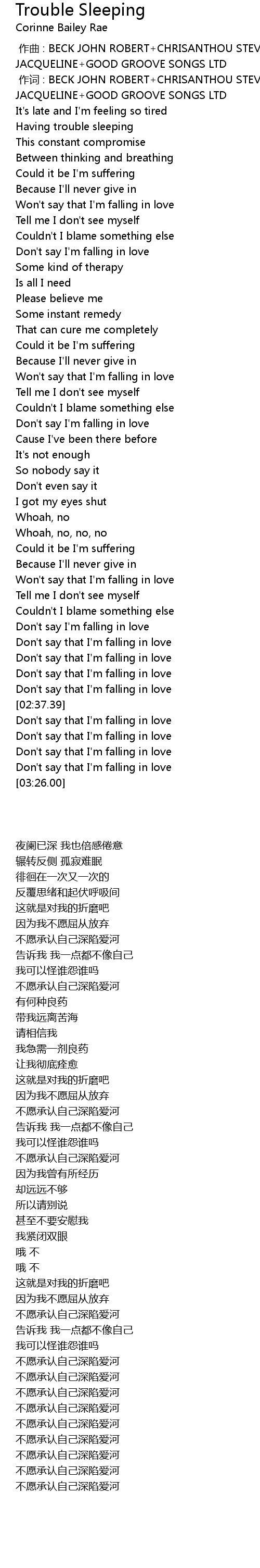 | [00:07.32] | It' s late and I' m feeling so tired |
