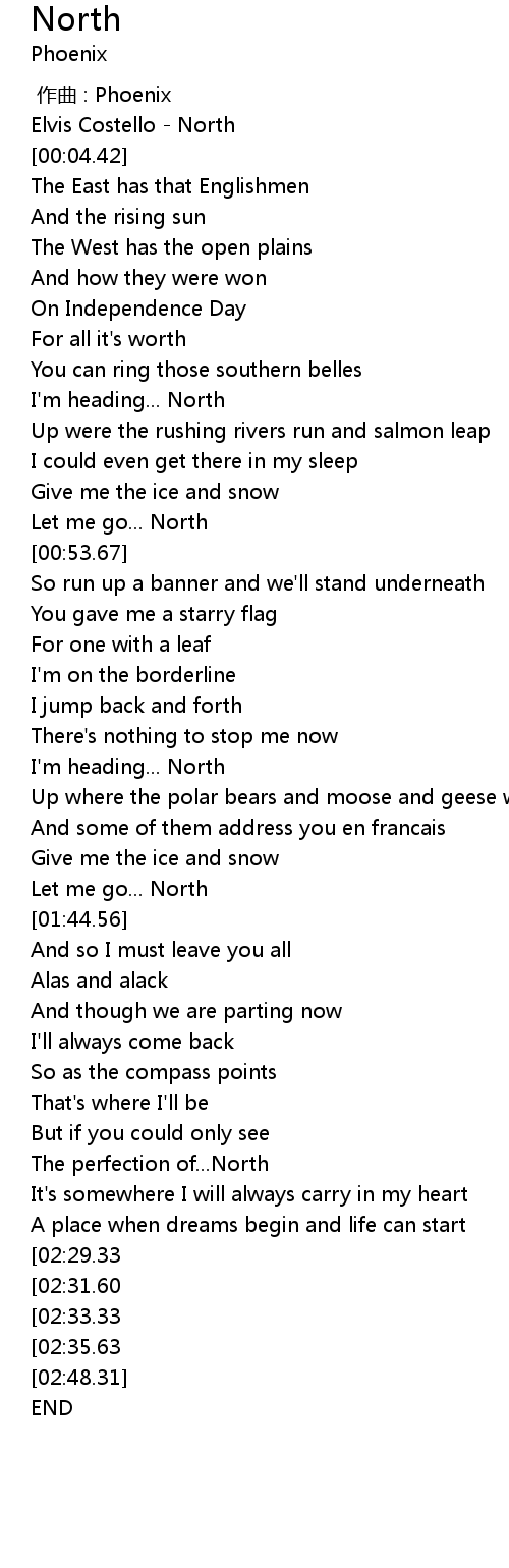 | [01:24.97] | Up where the polar bears and moose and geese will play |