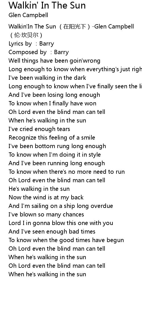 | [00:00.00] | Walkin' In The Sun zài yáng guāng xià Glen Campbell lún kǎn bèi ěr |