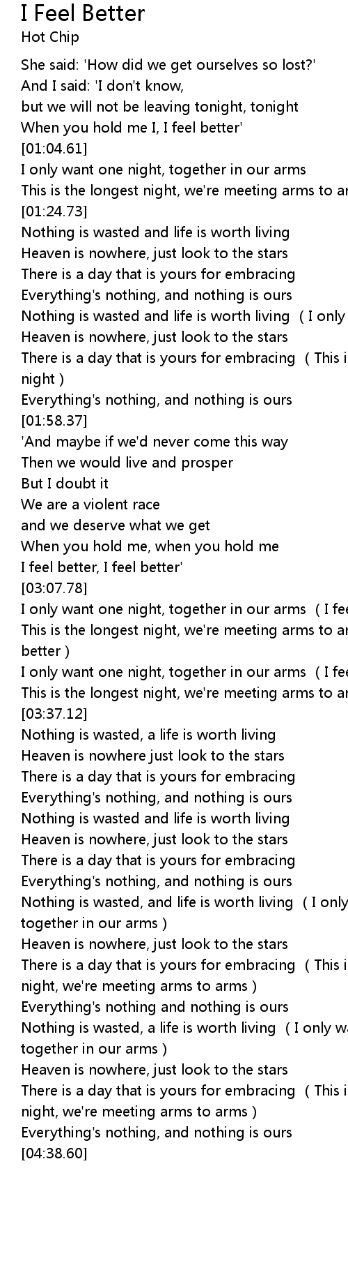 | [03:14.88] | This is the longest night, we' re meeting arms to arms I feel better |