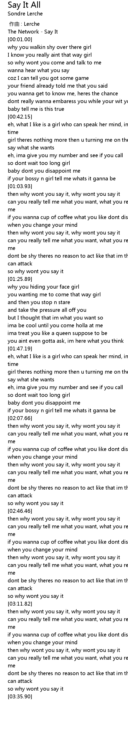| [03:00.92] | then why wont you say it, why wont you say it |