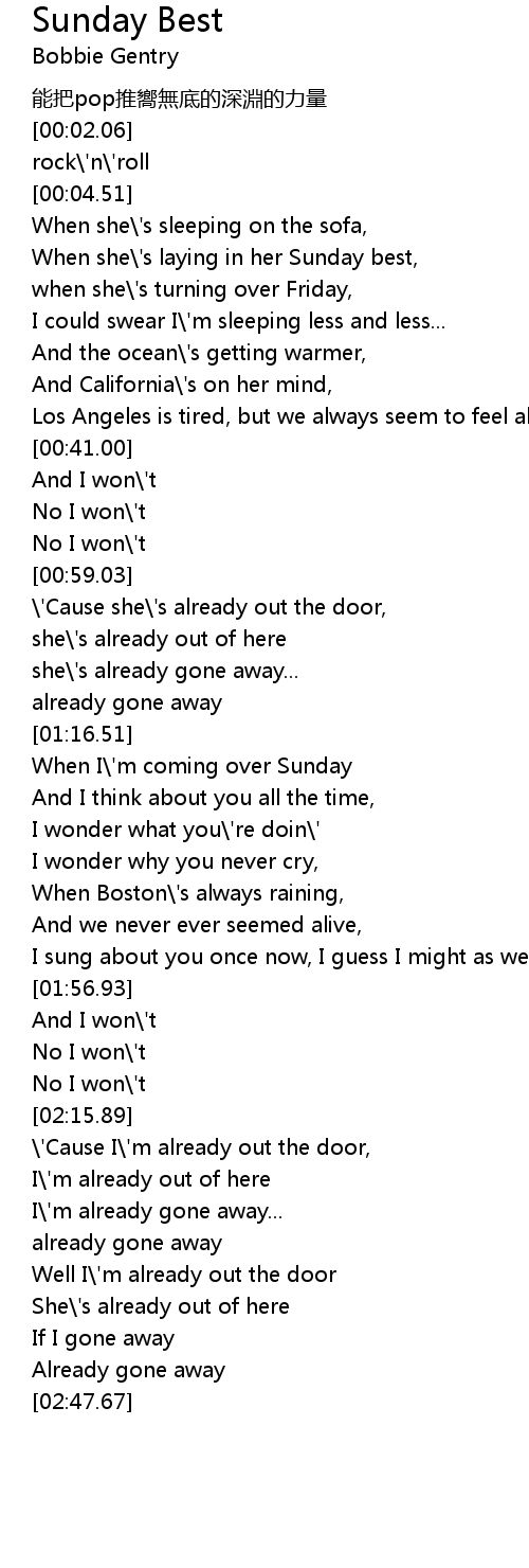 | [00:17.23] | When she\'s laying in her Sunday best, |