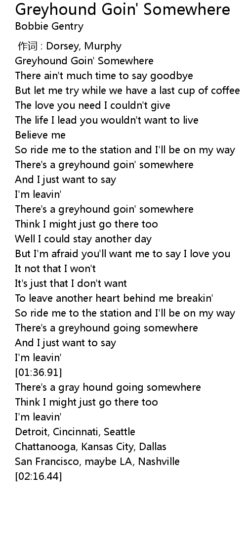| [00:36.12] | There' s a greyhound goin' somewhere |