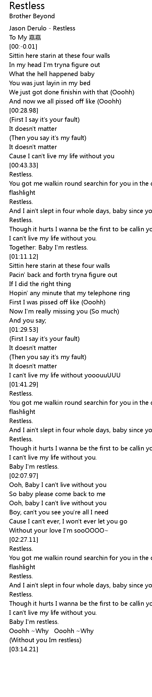 | [03:09.40] | Without you Im restless |