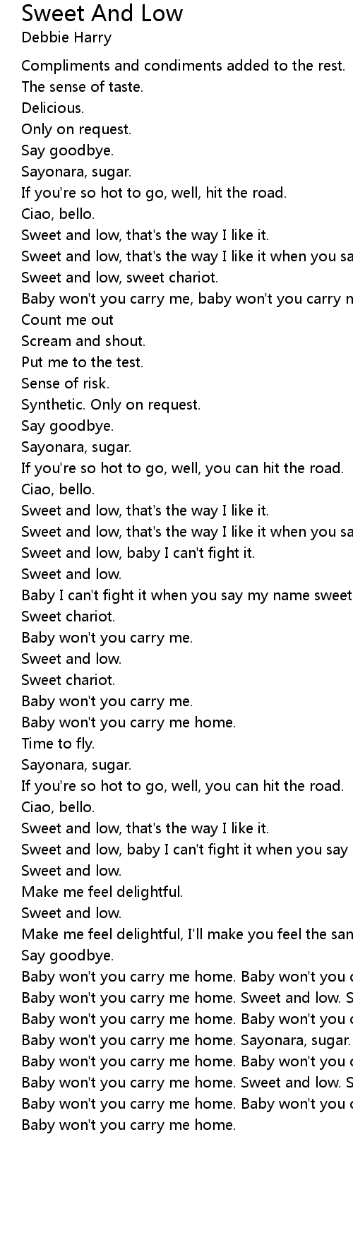 Baby won't you carry me home. Sweet and low. Say goodbye. |