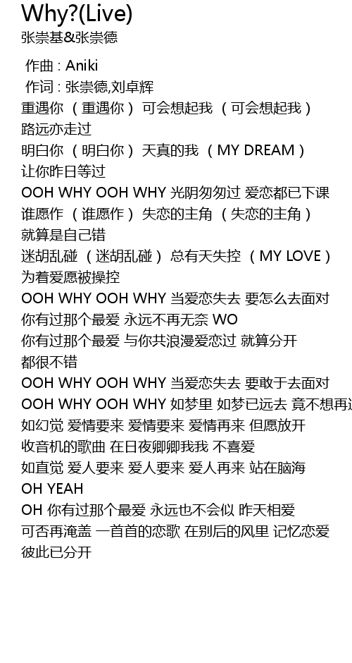 | [01:30.18] | OOH WHY OOH WHY 当爱恋失去 要敢于去面对 |