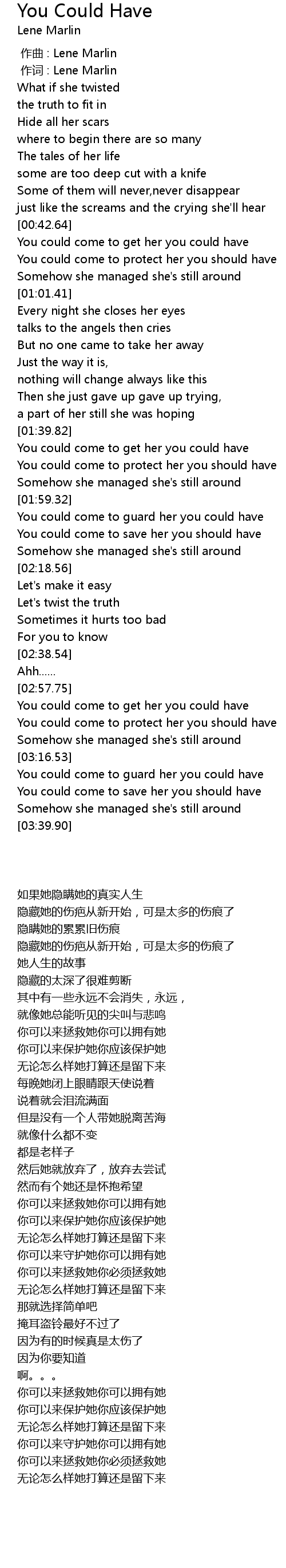 | [03:04.84] | You could come to protect her you should have |