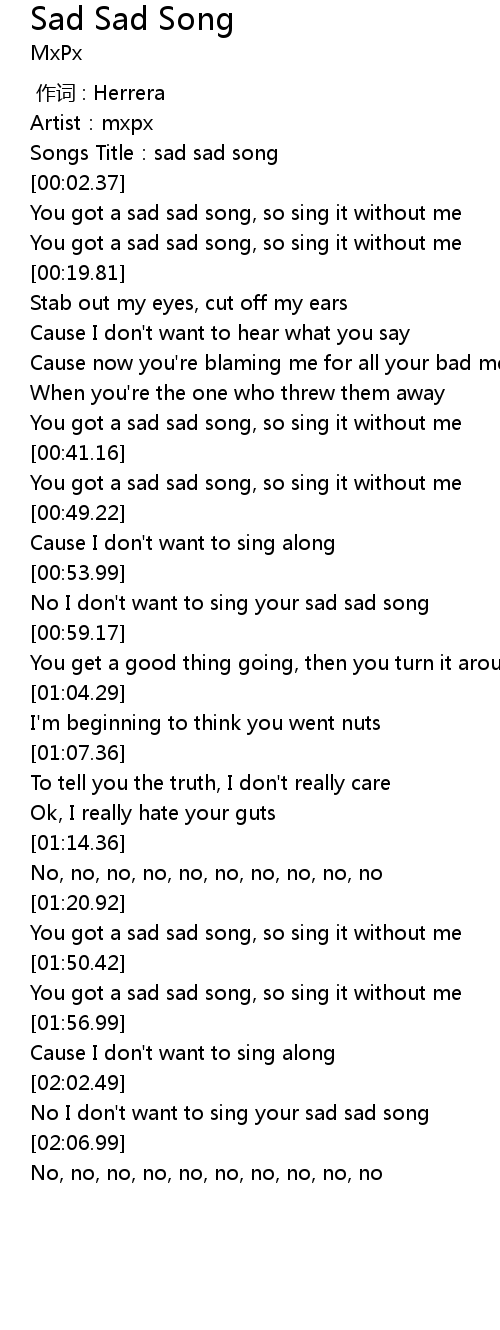| [02:04.49] | No I don't want to sing your sad sad song |